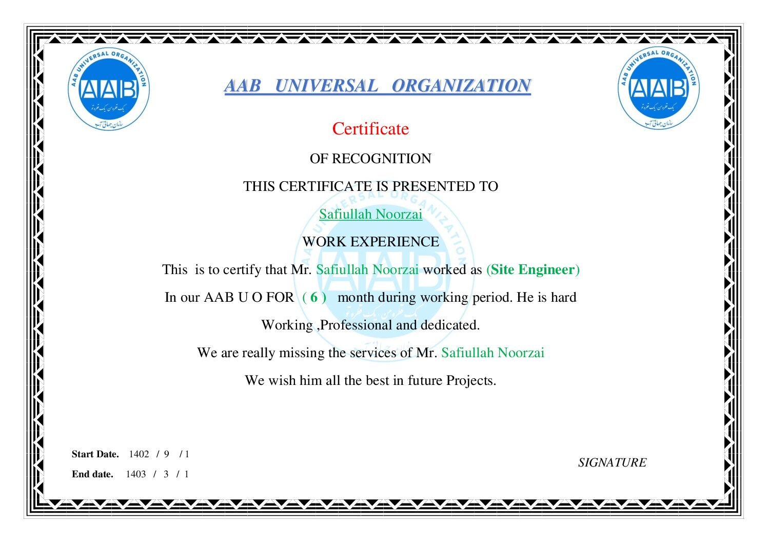Official AAB Certificate Herat Houses